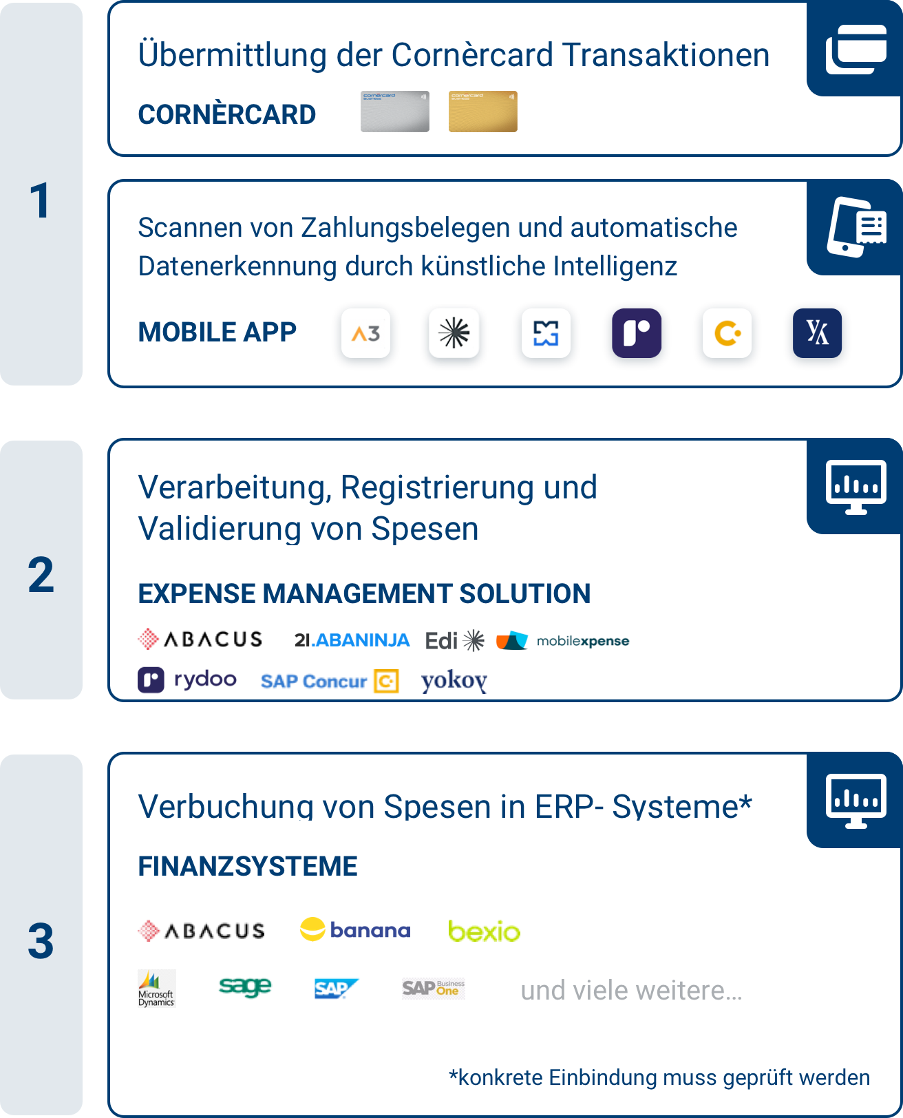 - The Cornèrcard transactions are displayed in real time in the expense management tool (Abacus, AbaNinja and Edi in real time; MobileXpense, Rydoo, SAP Concur, Yokoy, Zoho and Zucchetti on a daily basis).