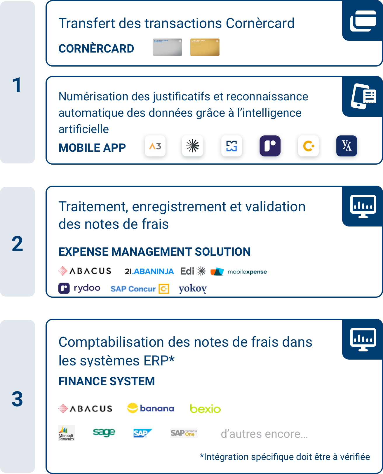 - Les informations sont transmises dans les systèmes ERP de l'entreprise pour la comptabilisation des frais.
