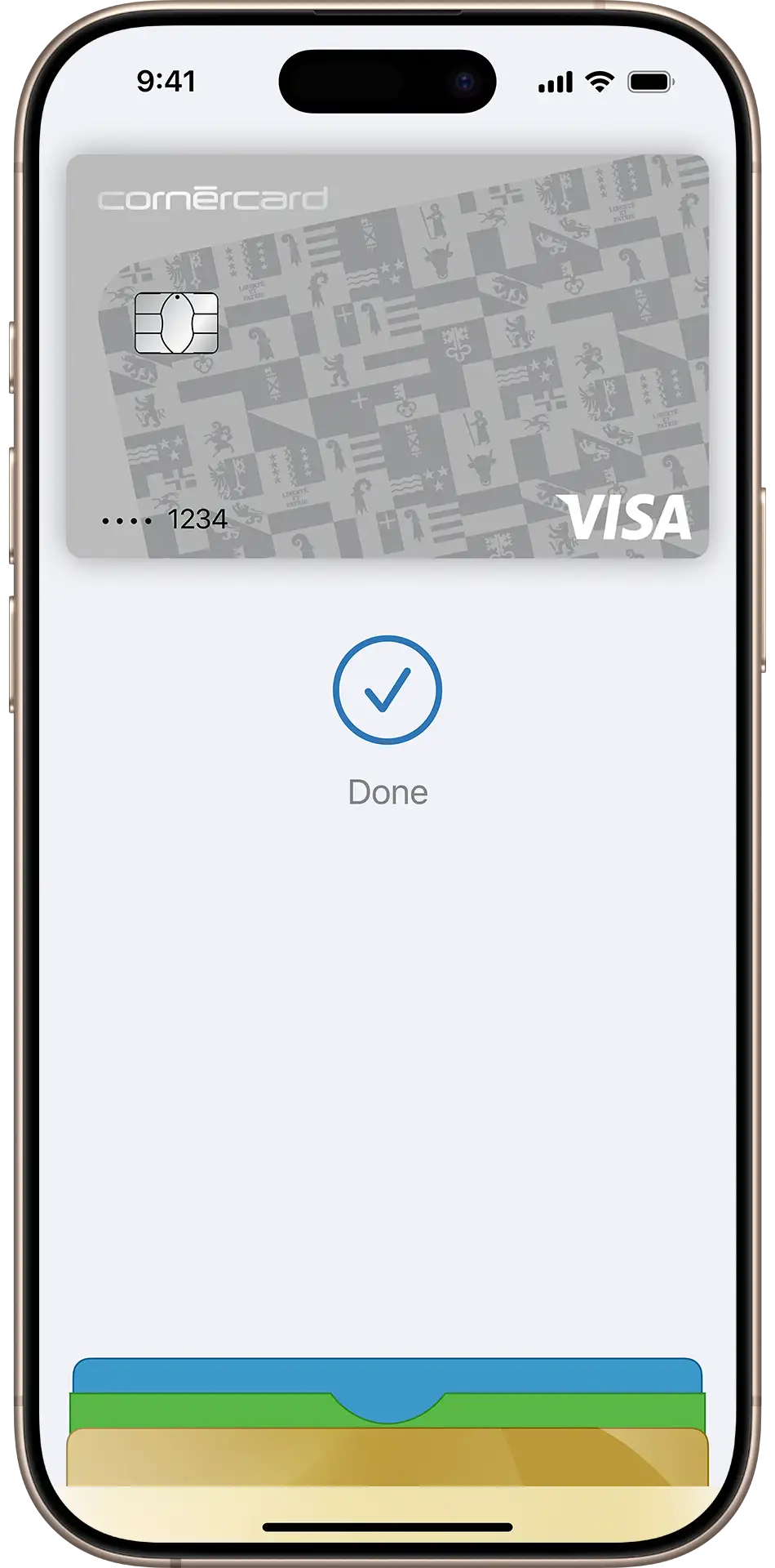 Quando si paga con Apple Pay, questo device account number e un codice di sicurezza valido una sola volta vengono utilizzati per elaborare il pagamento con la tua Cornèrcard.